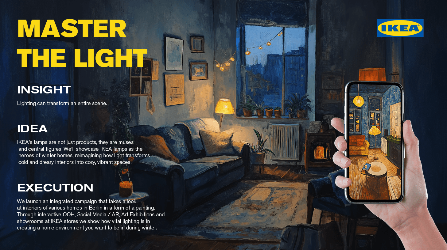 Winters in Berlin are cold, gloomy and dull. We showcase IKEA lamps as the heroes who save us during winter, reimagining how light transforms cold and dreary interiors into cozy, vibrant spaces.